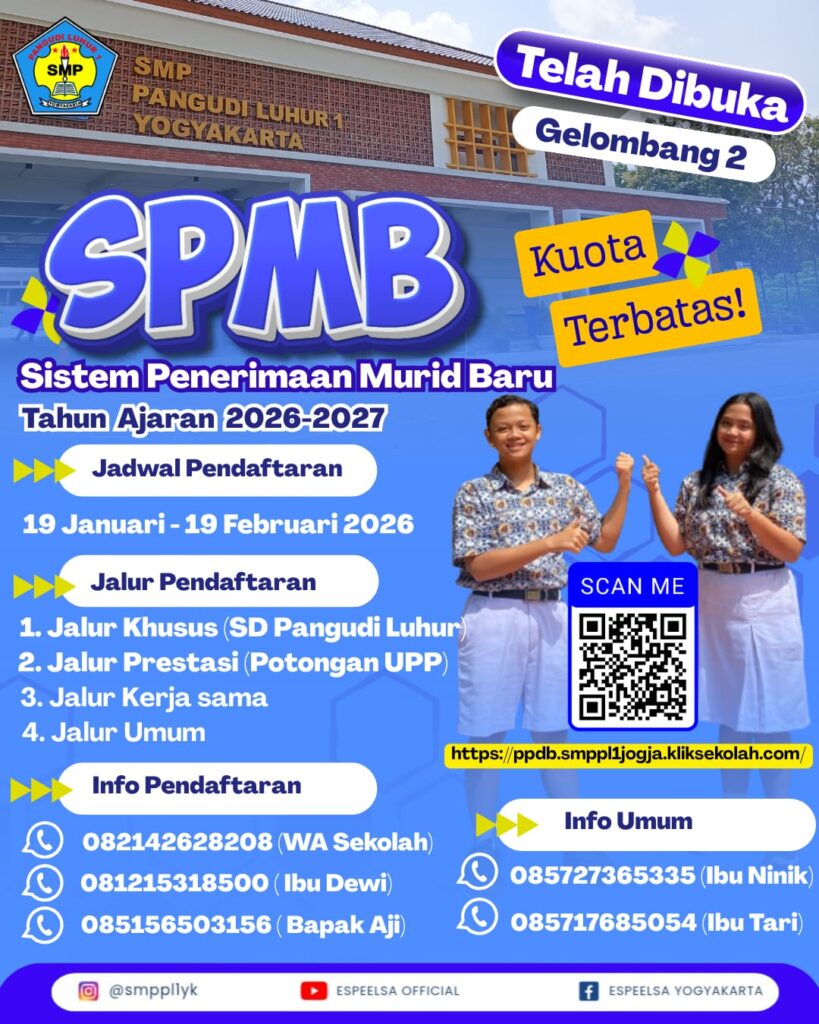 Telah dibuka SPMB Gelombang 2 di SMP Pangudi Luhur Yogyakarta. Pendaftaran dibuka dari tanggal 19 Januari 2026 – 19 Februari 2026. Link pendaftaran sebagai berikut: https://ppdb.smppl1jogja.kliksekolah.com/
